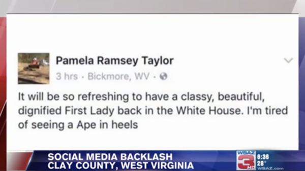 “Será refrescante tener una primera dama digna, hermosa, elegante en la Casa Blanca. Estoy cansada de ver una simia en tacones”, escribió Pamela Ramsey Taylor, directora de Clay County Development Corp., luego que Donald Trump fuera elegido presidente. Inmediatamente, la alcaldesa de Clay, Beverly Whaling, respondió al comentario: “Me acabas de alegrar el día, Pam”.