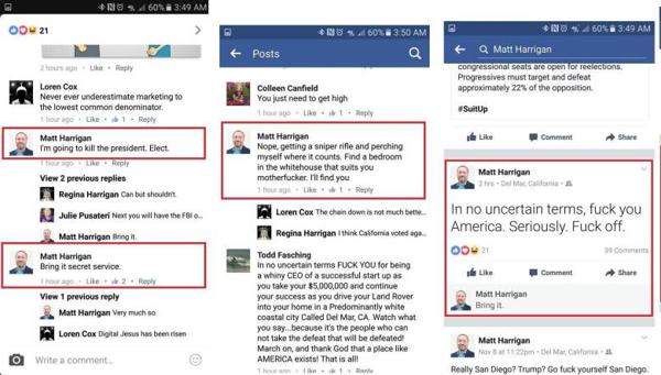 La noche de las elecciones, Harrigan estaba desalentado por el triunfo del líder republicano. Bebió de más y decidió volcar su ira en su cuenta de Facebook. Mala idea. “Voy a matar al presidente. Electo”, publicó. “Traigan al Servicio Secreto”, desafió.