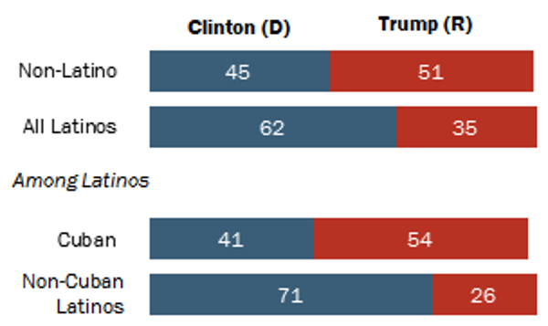 Una porción significativa de los cubanos en la Florida votaron por Hillary Clinton, el 41%, pero esto fue muy por debajo del 71% de los latinos no cubanos que respaldaron al candidato demócrata. Al mismo tiempo, el nivel de apoyo a Trump entre los cubanos fue similar al de los no latinos en todo el estado (51%).