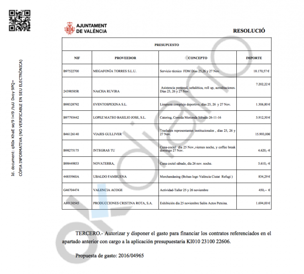 Otros contratos menores que incluyó la corporación de Ribó fueron el servicio de lenguaje de signos, una exhibición de baile, más de 800 euros en merchandasing (bolsas de tela con el logo de València Ciutat Refugi), limpieza o asistencia al personal (acreditaciones, señalética…).