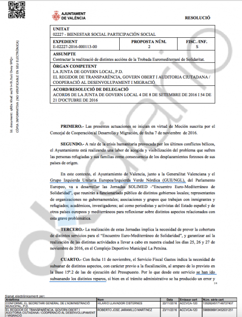El expediente indica que se trata de “desarrollar las Jornadas SOLIMED –Encuentro Euro-Mediterráneo de Solidaridad, que reunirán a funcionariado público de distintos gobiernos locales; representantes de organizaciones no gubernamentales; asociaciones y grupos que trabajan con inmigrantes y refugiados; académicos, investigadores; así como periodistas y activistas del Estado español y de otros países europeos y mediterráneos para reflexionar sobre distintos aspectos relacionados con esta grave problemática”.