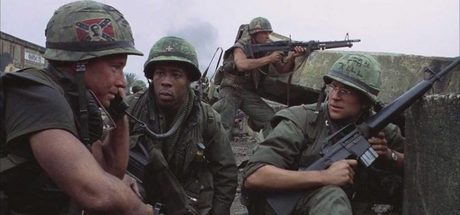 Literalmente, Pelotón. En 1986, Oliver Stone ajustó cuentas con Vietnam y con la película Los Boinas Verdes, que glorificaba el conflicto. Para ello, realizó una película que reflejaba sus vivencias en la guerra. A través de los ojos de Chris Taylor, un soldado novato, vemos el enfrentamiento cainita entre el sargento Elias y el sargento Barnes, que se saldará cuando el segundo deje morir al primero en territorio enemigo. Taylor, horrorizado, tratará de vengar a su superior, en tanto sus ideales principios se van erosionando durante su estancia en el país asiático. Posiblemente uno de los retratos más duros y certeros sobre la Guerra de Vietnam, y con una banda sonora de lujo.