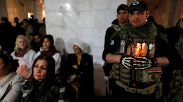 Durante la misa, las fuerzas de seguridad permanecieron desplegadas alrededor de la iglesia de esta ciudad donde numerosos edificios han quedado devastados y en la que abundan las pintadas a favor de ISIS.