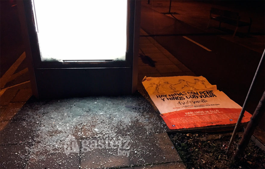 Numerosas marquesinas de Pamplona han aparecido rotas en la mañana de hoy como respuesta contundente a la campaña que publicitaba la transexualidad infantil bajo el lema: “Hay niñas con pene y niños con vulva”. También en Vitoria los vecinos han dejado constancia de su malestar como ilustra la imagen que publicamos.