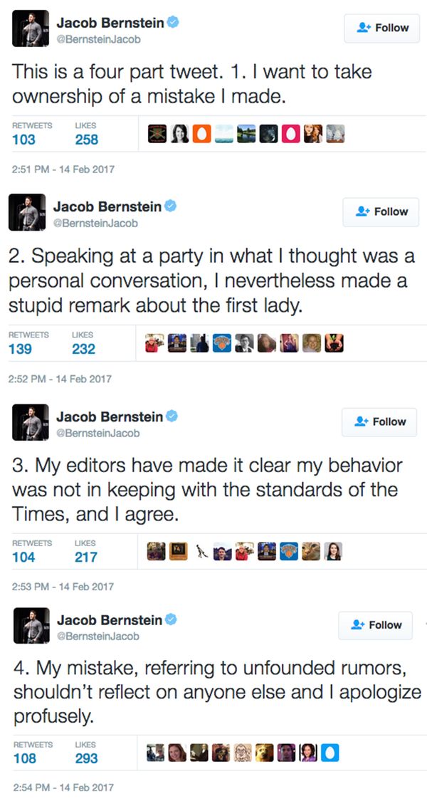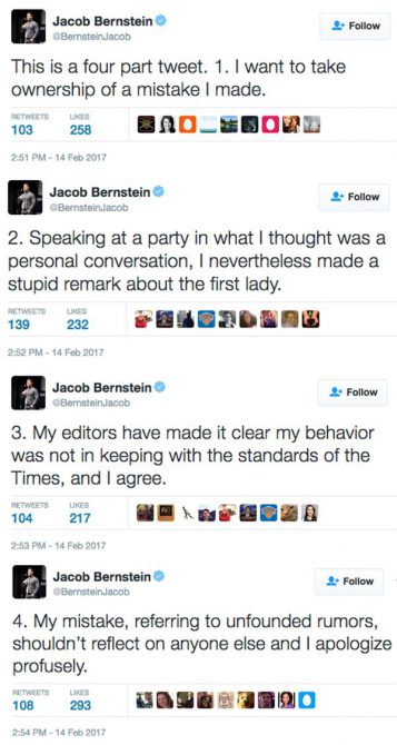 “Quiero reconocer un error que he cometido. Hablando en una fiesta en lo que pensaba que era una conversación privada, hice un comentario estúpido sobre la primera dama”, admitió Bernstein en un tuit.