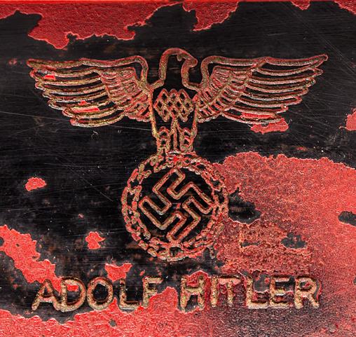 En el reverso del siniestro artilugio, se lee claramente el nombre de Adolf Hitler en letras mayúsculas, grabado junto al águila y la esvástica que adoptó como símbolo el Partido Nazi.