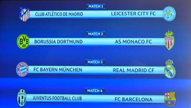 Atlético-Leicester, Bayern-Real Madrid, Juventus-Barcelona y Dortmund-Mónaco serán los cuartos de final de la Liga de Campeones. La ida se jugará el 11-12 de abril y la vuelta, el 18-19 del mismo mes.