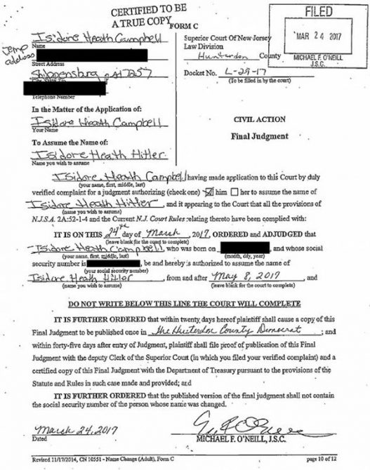 Isidore Heath Campbell logró finalmente lo que tanto deseaba. Un tribunal superior de New Jersey lo autorizó a modificar su nombre, que a partir del 8 de mayo próximo será Isidore Heath Hitler.