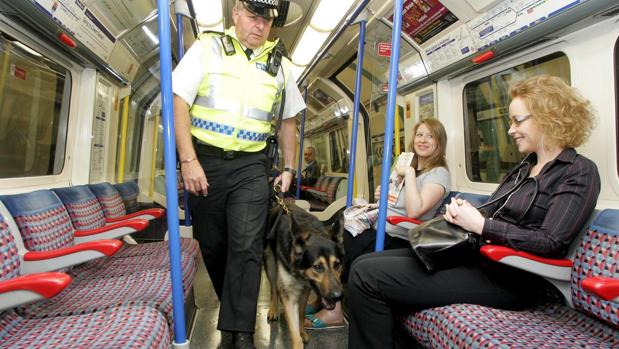 Un oficial de policía de transporte británico y su perro patrulla supervisan un vagón del metro de Londres tras su reapertura en agosto de 2005, días después del atentado de Al Qaida en la capital inglesa