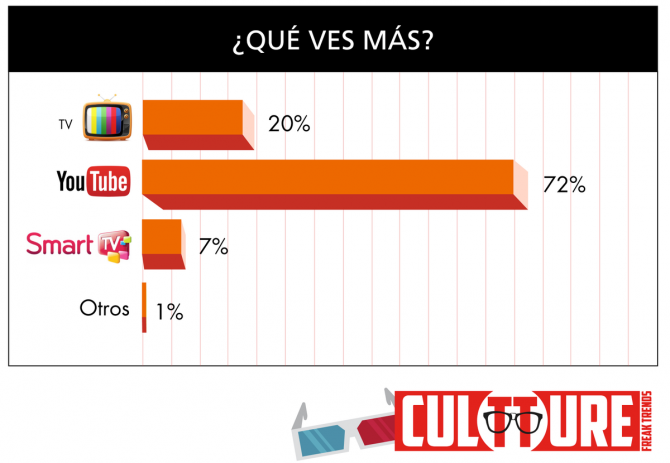 La web de nuevas tendencias Cultture.com ha querido saber qué porcentaje concreto de la gente joven reconoce consumir diariamente más minutos de youtube que de televisión pública o de pago. Para esta encuesta, se ha preguntado a una base propia de datos de 8.000 usuarios españoles, hombres y mujeres, con edades comprendidas entre los 18 y los 35 años, de los cuales han participado y respondido de manera válida 1.682 personas. Estos son los resultados: