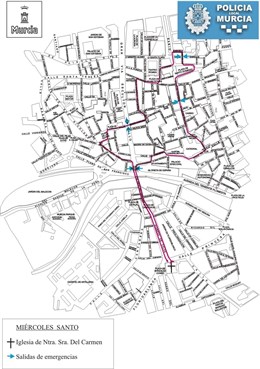 Esta archicofradía invierte más de seis horas en realizar su recorrido por la ciudad, por lo que cuando está terminando de salir a la calle, la cabeza del cortejo ya se encuentra en los aledaños de la iglesia del Carmen para empezar a recogerse, quedando “la ciudad en Miércoles Santo literalmente abrazada e inundada por el desbordante discurrir de los archicofrades de la Sangre”, explica el portal regmurcia.com.