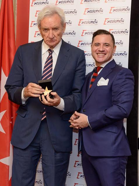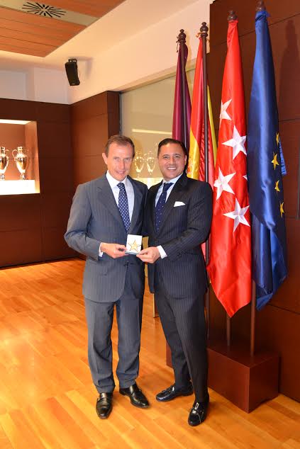 Ignacio de Jacob y Gómez entregando la Estrella de Oro de la Excelencia y el Título de Consejero de Honor a Emilio Butragueño, director de Relaciones Institucionales del Real Madrid C.F.