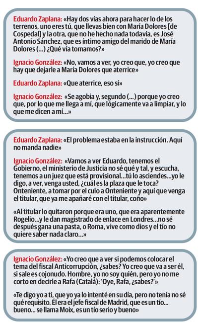 Sin embargo, otras intervenciones, ya en noviembre y con el Ejecutivo ya configurado, sí demuestran una intención más firme de los intervinientes. Zaplana explica a González: «Hay dos vías ahora para hacer lo de los terrenos, uno eres tú, que te llevas bien con María Dolores (De Cospedal) y la otra, que no he hecho nada todavía, es José Antonio Sánchez, que es íntimo amigo del marido de María Dolores. ¿Qué vía tomamos?», se pregunta. Ambos convienen unos minutos más tarde que hay que dejar que aterrice la nueva ministra.