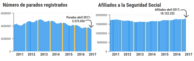 Según los datos publicados por el Ministerio de Empleo y Seguridad Social, respecto a abril de 2016 el número de desempleados disminuyó en 438.135 personas, marcando también una bajada histórica.