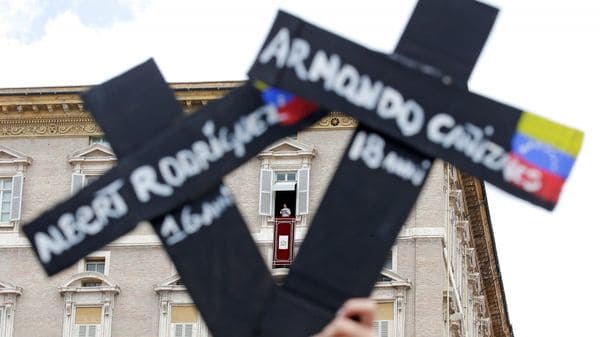Venezolanos protestan ante el papa Francisco con los nombres de las víctimas de la brutal represión narcocomunista