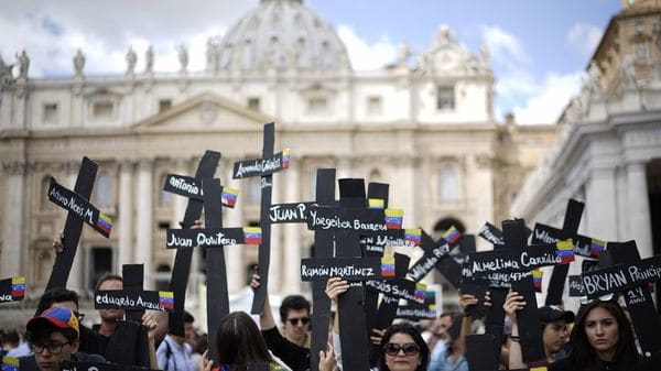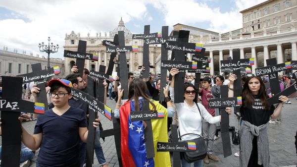 Un grupo de venezolanos organizó este domingo una protesta en el Vaticano para exigir, frente al papa Francisco, una condena al régimen de Nicolás Maduro por la violenta represión del último mes frente a los actos convocados por la oposición.