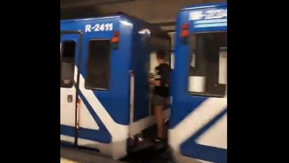 Captura de imagen en la que se aprecia a dos adolescentes en uno de los acoples de los convoyes del Metro de Madrid en la Línea 1, tres paradas antes del suceso).