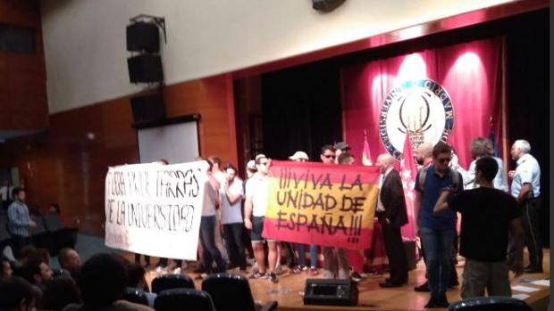Los jóvenes han entrado en el Aula Magna con gritos de «Fuera proetarras de la Universidad» y han desplegado una pancarta y banderas de España junto a la mesa donde se estaba abordando la ‘Incriminación de la incitación al odio y riesgos para la libertad de expresión’ con la participación de Raúl García, uno de los dos titiriteros de la compañía Títeres desde Abajo que fueron encarcelados y puestos en libertad acusados de ensalzar a ETA y Al Qaeda por exhibir el cartel «Gora Alka-ETA» en una obra de guiñol.