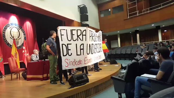 Quince jóvenes del Sindicato Español Universitario, asociado a La Falange, han irrumpido este jueves en el Aula Magna de Getafe de la Universidad Carlos III donde se están celebrando unas jornadas sobre ‘La represión penal en la sátira política’ en las que intervienen, entre otros, el cantante del grupo Def con Dos, César Strawberry, condenado a un año de prisión por enaltecimiento del terrorismo y humillación a las víctimas a través de sus tuits, o los titiriteros de «Goral Alka-ETA».