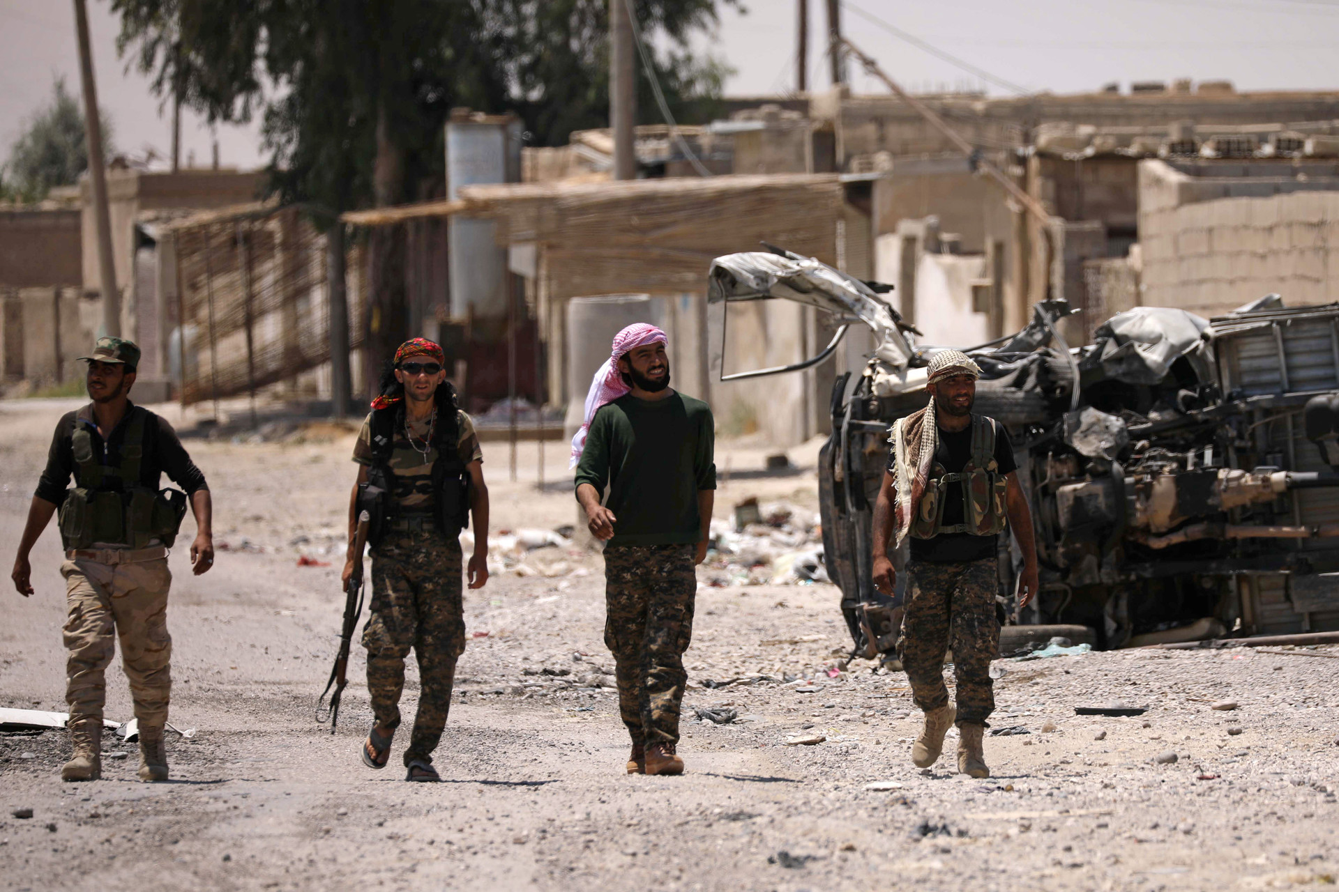Varios hombres de las Fuerzas Democráticas Sirias caminan junto a un vehículo destruido en Raqa. 11 de junio de 2017.