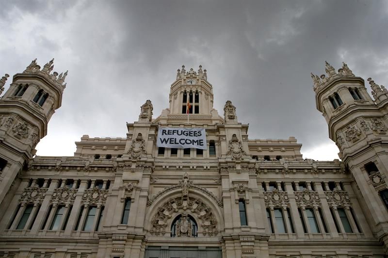 Detalle de una pancarta con la leyenda “Refugees Welcome” -“Refugiados, bienvenidos”, colocada en la fachada del Palacio de Cibeles, sede del Ayuntamiento de Madrid.
