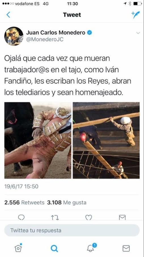 Sr. Monedero: Los policías, soldados y bomberos que mueren en acto de servicio y sacan sus caras en todos los medios de prensa, ¿no los considera usted currantes muertos en el tajo tampoco, o es que sólo le provoca exaltación cuando se trata de un torero? Usted podrá estar a favor o en contra de la Fiesta Nacional, pues su derecho a opinar como cualquiera. Pero este tipo de demagogia facilona sobre un hombre muerto (por cierto, mucho más valiente que usted), es de una falta de respeto que no tiene nombre. Ya que le importa más la vida de… Leer más »