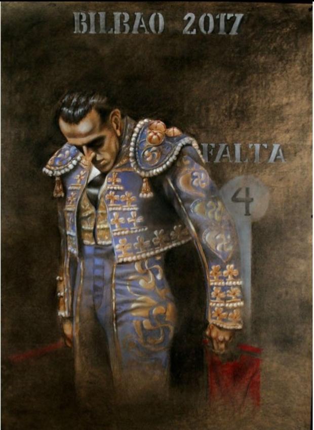 En referencia al frontón de Miribilla (Bilbao), Humaran ha plasmado al torero sobre un fondo negro, en el que ha incluido el número 4, haciéndose valer así, según ha explicado, de la palabra ‘falta’, la misma que supone en la práctica de pelota no llegar en el saque a alcanzar tal línea con el citado número.