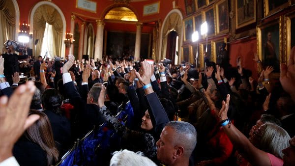 Dirigentes del chavismo gobernante en Venezuela desde 1999 han encabezado la larga fila de representantes que han entrado en el palacio Legislativo donde opera el Parlamento opositor para este acto. Los miembros de la Asamblea Constituyente han irrumpido en la sede parlamentaria enarbolando los cuadros del fallecido presidente Hugo Chávez y del libertador latinoamericano Simón Bolívar, que fueron retirados cuando la Asamblea Nacional cambió de color político, en 2016.