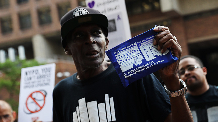 Un participante de la marcha de protesta contra la crisis de sobredosis de drogas convocada en Nueva York, EE.UU., el 10 de agosto de 2017.