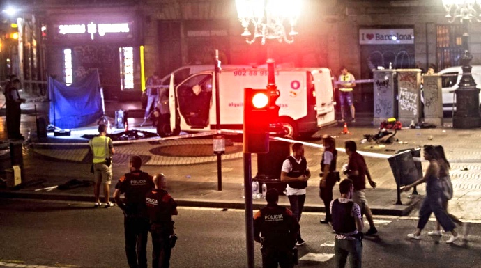6.- La tarde del 17, una furgoneta irrumpe en Las Ramblas a gran velocidad. Ello es posible porque no existían barreras en la zona peatonal pese a que la Policia Nacional recomendó instalarlas antes de Navidad. Los Mossos y la alcaldesa de Barcelona se negaron a la instalación de bolardos, maceteros u otros obstáculos.