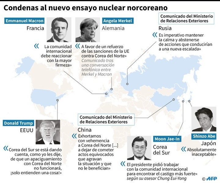 China, Rusia, Japón, Corea del sur y Francia condenaron rápidamente esta nueva violación de las múltiples resoluciones de la ONU que exigen el fin de los programas nuclear y balístico de Corea del Norte. Moscú hizo además un llamado a la calma.