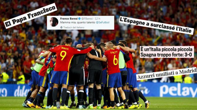 En otros países España también aparece en todos los titulares: “España le da una clase a Italia”, dicen en L’Èquipe, o “El Papa Francisco” para referirse a Isco, desde Argentina.