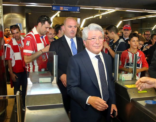 Volviendo al metro. A saber los motivos, Enrique Cerezo decidió salir de Amazónico, donde comió con la directiva del Málaga, ir hasta la estación de Parque de las Avenidas y, a eso de las 17.00 horas, coger la línea 7 de metro hasta Metropolitano. En el vagón, los primeros cánticos: «El escudo no se toca». Rodeado de su guardaespaldas y algún otro miembro de la directiva rojiblanca, el presidente fue viendo cómo a su alrededor aumentaba la tensión. A la salida, en las inmensas escaleras que dan acceso a la nueva casa del Atlético, incluso se encaró con algún aficionado. Para evitar males mayores, fue acelerando hasta entrar en la tienda del club, atestada a esta hora, y buscar tranquilidad en el almacén, que básicamente fue lo primero que tuvo a mano el buen hombre.Fuera, la vida seguía. Pasaban muchas cosas. Pasaban unos hinchables a pleno rendimiento para los niños, unas barras que, en las horas felices (ya saben, 2×1), terminaban sin cambio y casi sin barriles, un Dj que se venía arriba con el «Madridista el que no bote es, es» y unas discusiones muy simpáticas sobre si la tercera equipación del equipo es ahora verde o azul, o las dos cosas. Hubo que tener paciencia en el metro, cierto, pero casi más se necesitaba en la tienda a primera hora de la tarde. La estrella de las ventas fue una camiseta conmemorativa del estreno del Wanda Metropolitano. Burro (no es un insulto, es ese carrito donde van colgadas muchas perchas) que aparecía en la tienda, burro que se quedaba vacío. Eso sí, como la cola para pagar era parecida a la del Zoo en un día festivo, muchos desistían.