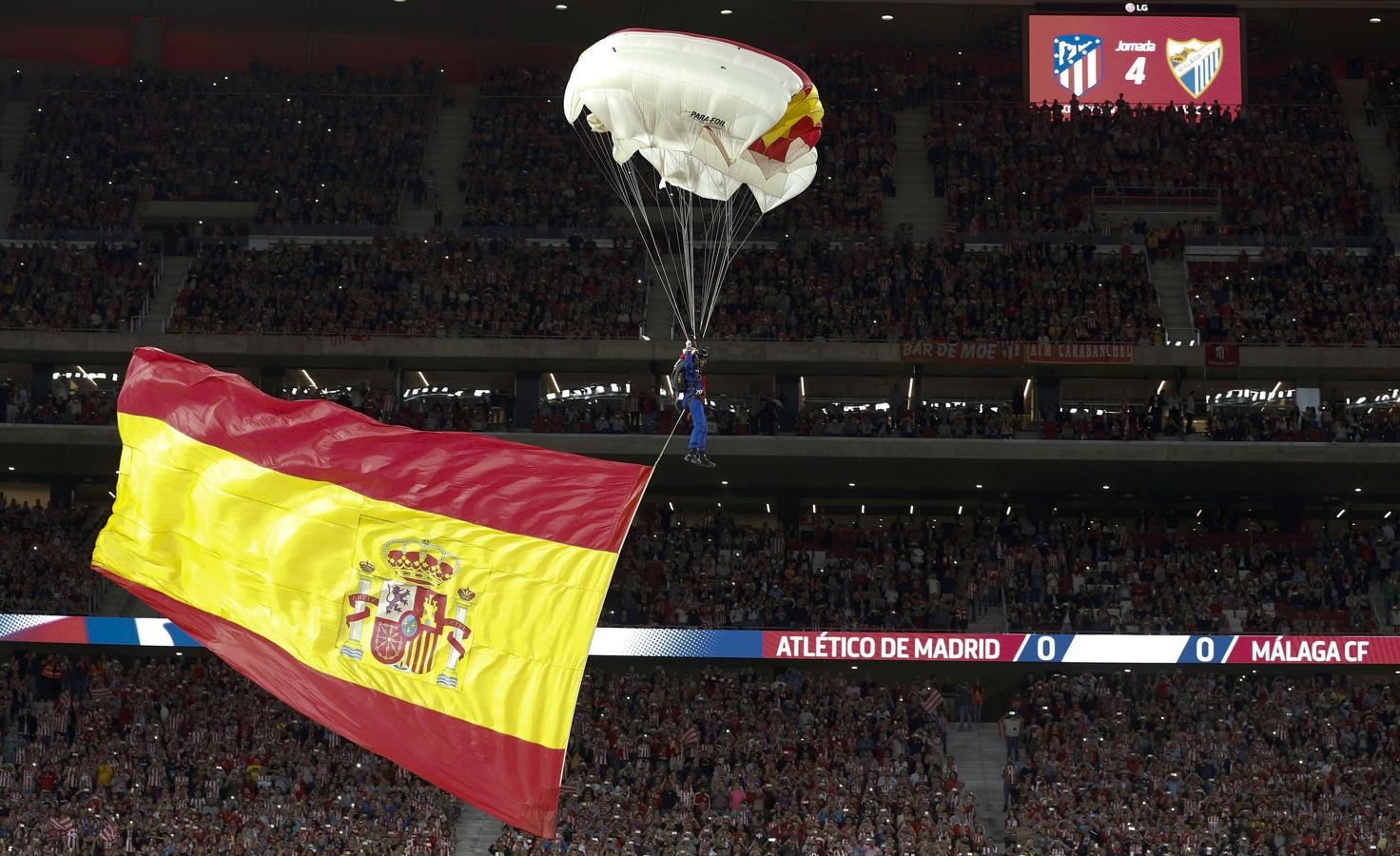 A la salida, alguna papelera desbordada y la marabunta procedente del metro en aumento. A las siete se abrieron las puertas y cuando faltaba más de un cuarto de hora el estadio estaba prácticamente lleno. Las canciones, las de siempre y, claro, el himno también. Un himno que dice que ellos se van al Manzanares, al estadio Vicente Calderón. La gente se reencontró con sus cánticos acaso para no sentir que todo era nuevo, que la esencia del viejo estadio seguía en el nuevo. Llegó Su Majestad el Rey Felipe VI, bajaron los paracaidistas, un clásico, y salieron Gárate, Torres y Hugo (un chico de la cantera) a hacer el saque de honor. Para ese momento, quizá los dos de las escaleras ya tuvieran los ojos cerrados.