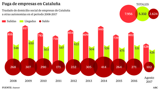 El progresivo aumento de la presión fiscal y el recrudecimiento del desafío secesionista desde la Generalitat, sumado a las habituales decisiones estratégicas de los empresarios, han provocado una fuga de compañías de Cataluña a otras regiones. Según datos del Registro Mercantil recopilados por la consultora Axesor, 7.956 empresas han trasladado su sede social de esta autonomías a otras comunidades entre enero de 2008 y agosto de este año. Teniendo en cuenta que en ese mismo tiempo «solo» 5.332 han apostado por ubicarse en esa región, el tejido empresarial de Cataluña ha disminuido en casi una década en 2.624 empresas.