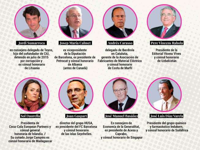 Los cónsules honorarios que ponen su cargo al servicio del nacionalismo son, por ejemplo: Sol Daurella, presidenta de Coca-Cola Europan Partners y cónsul de Islandia, José Manuel Basáñez, ex consejero de Economía de la Generalitat, ex presidente de compañías como Acesa o Caprabo y cónsul de Singapur, o Andrés Carasso, delegado de Iberdrola en Cataluña y cónsul de Costa de Marfil o Jordi Puig, exconstructor nacionalista y actual cónsul de Filipinas.