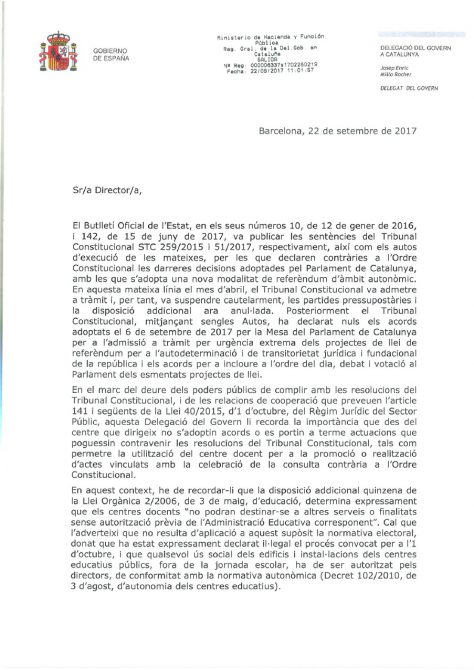 El Gobierno alerta a los directores de los institutos de las consecuencias de permitir el 1-O – Alerta Digital