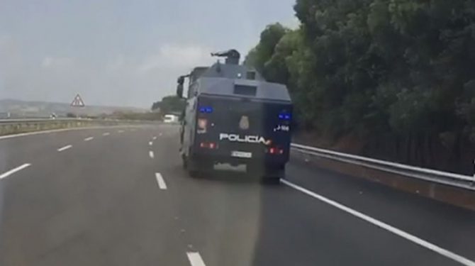 El Ministerio del Interior ha enviado tanquetas lanza agua en Cataluña en el marco de la operación policial que el Gobierno español ha emprendido para evitar el referéndum del 1-O. Estos vehículos de la policía nacional han sido vistos este viernes por la tarde en la AP7 en sentido Barcelona, según cuenta el portal e-noticies. Las tanquetas con cañones de agua son un tipo de vehículo policial antidisturbios que se utilizan para dispersar manifestaciones o concentraciones de gente cuando estas son especialmente violentas y suponen un peligro.