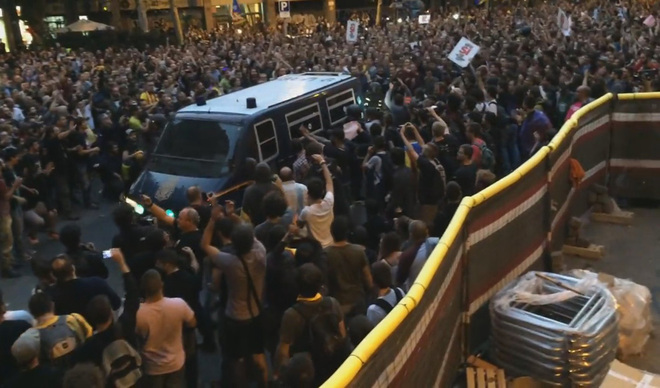 Más tarde, “la masa” intentó acceder al edificio por la fuerza. El testimonio de uno de los agentes dice: “El ambiente en el exterior era muy tenso y hostil, tirando objetos e insultando constantemente a los guardias civiles. También realizaban cánticos en los que decían ‘esta noche dormiréis aquí’ (…) sobre las 3 de la mañana hubo una carga violenta de los manifestantes contra las puertas en la que por parte de unos 15 agentes de Mossos y Guardia Civil hubo que aguantar las puertas, puesto que parecía que la masa podía tirarla abajo y acceder”.