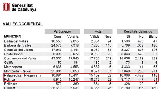Pero no es algo exclusivo de municipios pequeños. En Palau-solità i Plegamans y Polinyà (pueblos límitrofes, próximos a Sabadell y de cierta envergadura) se han dado exageraciones entre el número de votos emitidos y el número de habitantes censados. En Palau-solità (con un censo de 10.891 personas) se emitieron 15.491 votos. Y en Polinyà (con un censo de 5.910 personas) se dieron por válidos 10.215 votos, casi el doble de los habitantes censados.