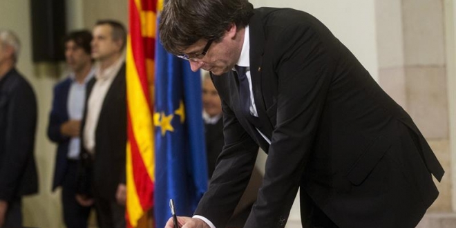 El presidente de la Generalitat, Carles Puigdemont, firma el documento sobre la Independencia después de comparecer ante el pleno del Parlament
