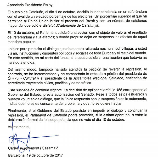 Fuentes oficiales respondieron así a la carta enviada por Puigdemont en la que dice al jefe del Ejecutivo, Mariano Rajoy, que si “persiste en impedir el diálogo”, el Parlamento autonómico “podrá proceder a votar la declaración formal de independencia” de Cataluña.