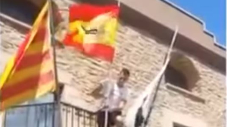 Después de los atentados de Barcelona y ante la negativa del alcalde a colgar la enseña, un joven trepó desde su coche hasta el balcón del Consistorio de Balsenaty (Barcelona) para colocar la bandera nacional con un crespón negro. .
