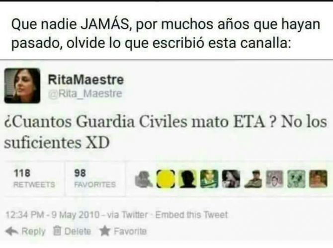 Todo un rosario de amorrados a la ubre pública que pesan como una losa sobre las espaldas de los sufridos contribuyentes españoles, y que ahora se quieren subir al carro de la euforia desatada en la calle por un pueblo que grita: “España unidad jamás será vencida”, intentando tapar su complicidad en la excarcelación desde 2008, de 487 criminales de ETA, mientras 300 asesinatos de esta banda están por investigar y esclarecer.