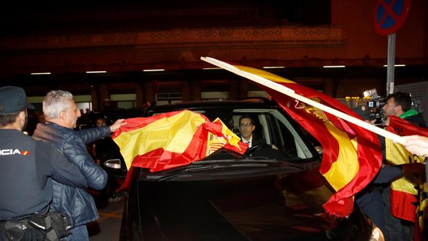 Un grupo de patriotas con banderas españolas han rodeado este mirécoles el coche de Anna Simó y Josep Nuet, miembros de la mesa del Parlament, a su llegada a la estación de Madrid-Atocha procedente de Barcelona para declarar mañana ante el Tribunal Supremo por los delitos de rebelión, sedición y malversación de los que la acusa la fiscalía.