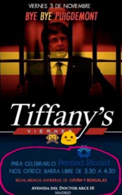 En el flyer del evento, se observa al líder del PdeCAT en una celda y de fondo una bandera de España. “Bye bye Puigdemont. Para celebrarlo Pernod Ricard (logo incluido) nos ofrece barra libre de 3.30 a 4.30. Regalaremos banderas de España y bengalas”, se puede leer en el anuncio que distribuyeron los relaciones públicas el mismo día del evento a través de las redes sociales. La discoteca está frecuentada por jóvenes veinteañeros de clase media alta y es una de las más de moda de la capital. Está ubicada en el elitista barrio madrileño de El Viso.No es la primera vez que una sala madrileña se posiciona políticamente en plena tensión separatista. El Teatro Barceló cubrió hace unas semanas su fachada con una gigantesca bandera de España y su DJ pinchó el himno nacional al igual que hicieron los pinchadiscos de las discotecas Kapital y Mitty.