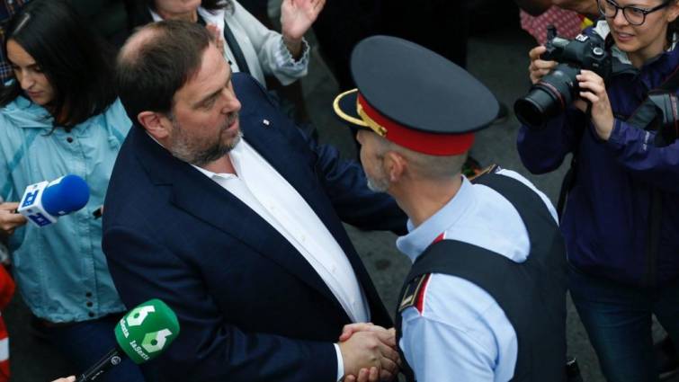 El vicepresidente de la Generalitat, Oriol Junqueras, saluda a un mosso a su llegada Escuela Sant Jordi de Barcelona para votar en el referéndum sobre la independencia de Cataluña