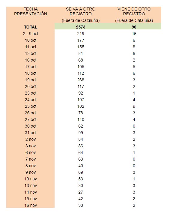 Tras el referéndum ilegal del 1-O, los días con el mayor número de traslados de sede de Cataluña fueron el pasado 19 de octubre, con 268 compañías; el 9 de octubre, con 212 entidades salientes, y el día 10 de octubre, con 177 empresas.