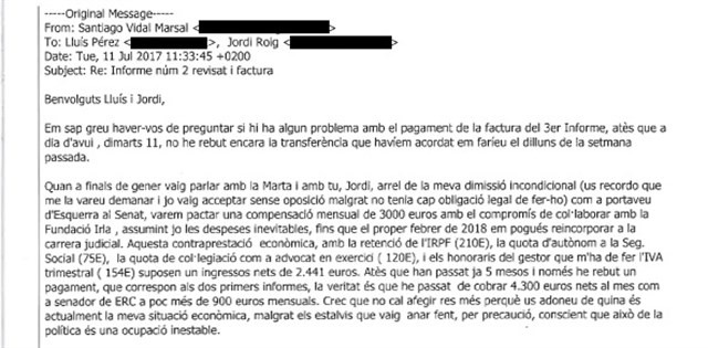 En este texto, Santiago Vidal afirmaba que, cuando a finales de enero habló con “Marta” y con “Jordi” le hicieron pedir la dimisión como portavoz de ERC en el Senado y la aceptó sin oposición aunque “no tenía la obligación legal de hacerlo”. El texto proseguía: “Pactamos una compensación mensual de 3.000 euros con el compromiso de colaborar con la Fundació Irla, asumiendo yo los gastos inevitables, hasta que el próximo febrero de 2018 me pueda reincorporar a la carrera judicial”.