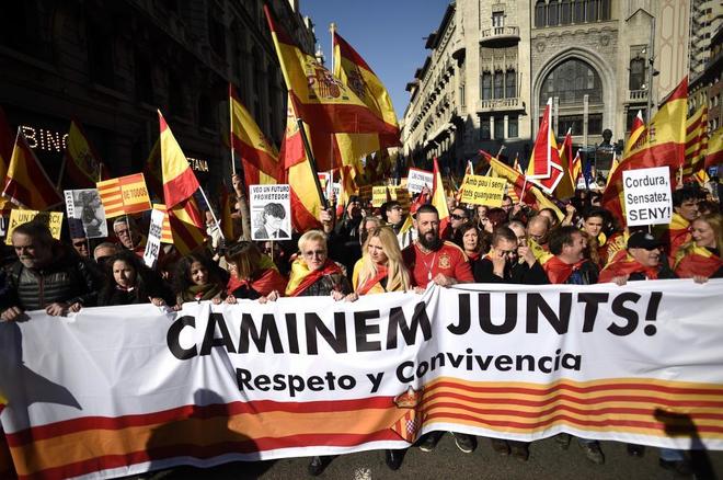 En la cabecera de la marcha se ha desplegado una pancarta con el lema “Constitución española: la ley de todos. Con la Constitución, por la concordia”, tras la cual se ha situado, además de dirigentes políticos, el presidente de Empresaris de Catalunya, Josep Bou, entre otros. Entre carteles con lemas como “Som Catalunya, somos España”, “Robaron, oprimieron, dividieron” o “Minoría golpista, ¡fascistas!”, los manifestantes han coreado la consigna “Esta es nuestra policía” al pasar junto a la sede de la Jefatura Superior de Policía en la Via Laietana.